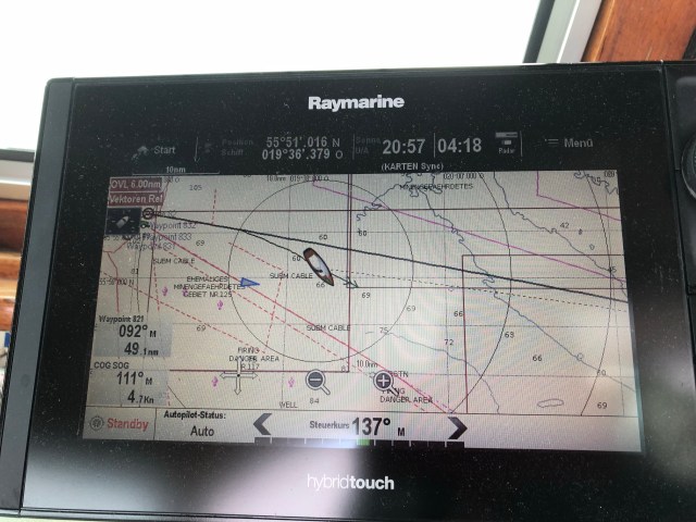 Früh am Morgen. Wir befinden uns an der Grenze Litauen, Russland. Wir segeln, d.h. ich segele das Boot, der Skipper schläft. Auf dem Plotter erkennt man ein unknown boat, das uns auf der russischen Grenze stetig folgt. Jetzt nur keine Fahrfehler machen. Ich mache mithilfe des Autopiloten eine Wende, dummerweise habe ich den Track nicht ausgeschaltet und der Autopilot übernimmt das Szepter. Nein. Was nu? Chris bekommt mit, das ich einen irren Iwan fahre und hilft mir aus der Klemme. Danach motoren wir zur Sicherheit. Ui, nochmal gut gegangen.