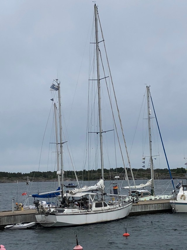 Ich hatte Wache, der Skipper schlief. Dann sah ich auf dem Plotter seltsame Formationen. Mal 1, mal 2 Boote hintereinander, das eine ein Segler, der andere unter Maschine fahrend. Ich nahm das Fernglas, nee das auf dem Wasser hatte ich noch nicht gesehen, konnte ich nicht einschätzen, da musste der Skipper ran. Erst war er unwirsch, ob des Weckens, dann war er interessiert, das hatte er auch noch nicht gesehen. Nun waren es sogar 3 Objekte auf dem Plotter, ganz dicht beisammen. Ah, es könnte ein Convoi sein. Dann kam seine Anweisung an den Eins O ( an mich) Funkkontakt aufzunehmen. Das tat ich dann auch brav. Leider konnte ich keinen Schiffsnamen auf dem Plotter erkennen, so funkte ich den Convoi mit ihren Positionsdaten und mit Convoi an. Ein netter Herr antwortete mir im exzellenten Englisch, sie hätten uns auch schon gesehen, ich fragte, ob wir unseren Kurs beibehalten sollen. Als Antwort kam, das wir den Convoi an Steuerbord passieren sollten. Als sie dann näher kamen, sahen wir des Rätsels Lösung: